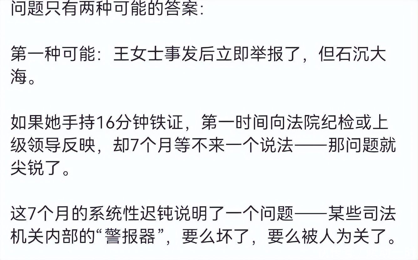 公众持续聚焦的核心,早已超越对单一责任人如何惩处的技术性讨论——人们迫切期待的答案是:顺着这条已被证实存在“复制粘贴式”作案痕迹的线索深挖下去,究竟还有多少位王女士尚未开口?那217天里层层递进却始终未被激活的监督链条,究竟在哪一环发生了实质性断裂?又是谁,在本该最讲程序、最重规则的司法场域里,亲手遮蔽了真相应有的光?