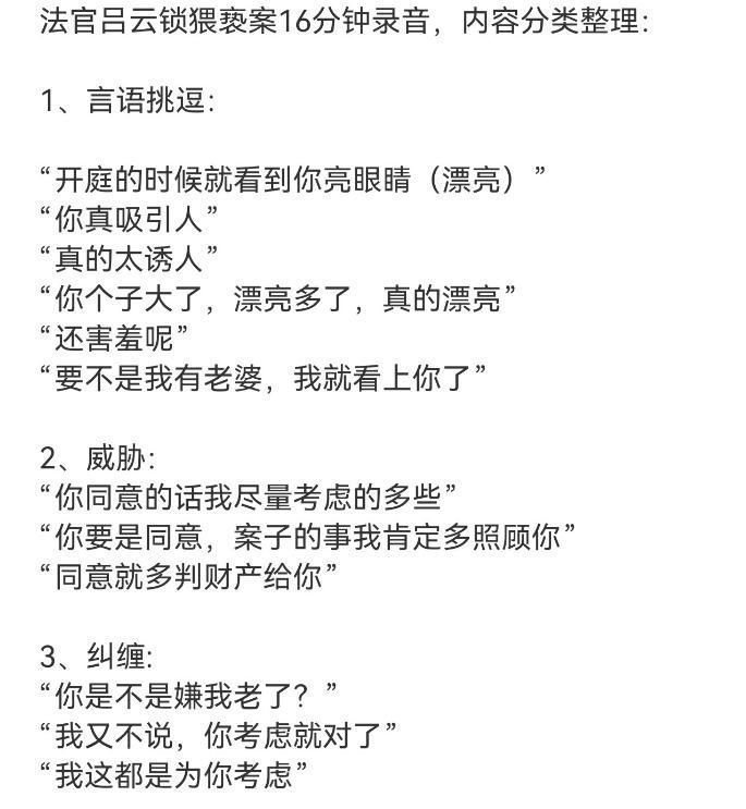 若该线索属实,则意味着吕某某的行为绝非孤立偶发,而极可能构成一种长期化、模板化、精准化的权力滥用模式——他将司法裁判权异化为个人索取不当利益的工具,把庄严的审判场所扭曲为实施控制与胁迫的私密空间,将每一位信任法律、走进法院寻求公正的女性,视作可筛选、可诱导、可操控的目标对象。