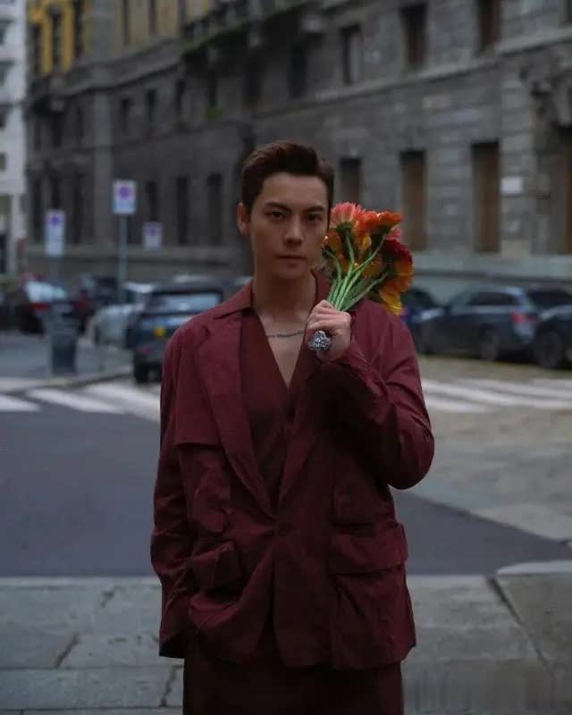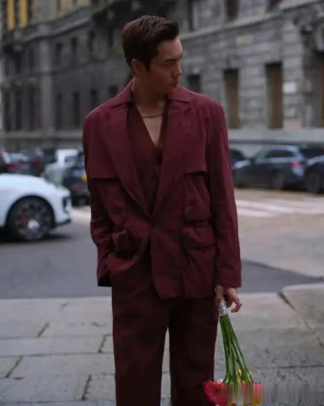 此次秀场造型堪称 “老钱风教科书”:他身着深 V 酒红色西装叠穿同色系大衣,利落剪裁完美凸显身材比例,冷冽气场与面料质感碰撞出高级感,台步从容稳健,双手插兜时的冷峻姿态被时尚媒体赞为 “行走的时尚雕塑”。